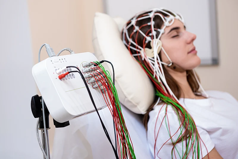 O eletroencefalograma é um exame que avalia a atividade elétrica do cérebro. O método registra e amplifica os impulsos elétricos ocorridos no cérebro e averiguar se o ritmo e intensidade de impulsos está dentro do normal.
