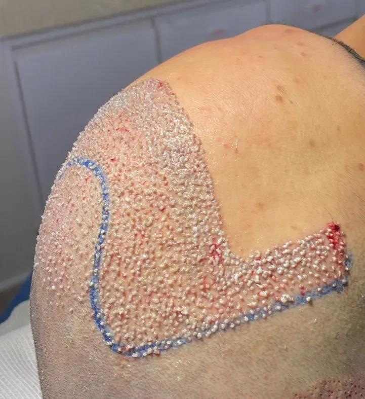Apesar de todas as incisões já terem sido criadas e, portanto, a direção de crescimento dos fios já estar estabelecida, essa é a última etapa da cirurgia e deve ser realizada da maneira mais breve possível, reduzindo o tempo dos folículos fora do corpo. Além disso, nessa etapa ocorre a maior manipulação dos folículos e, portanto, o máximo de cuidado deve ser tomado a fim de se evitar traumas ao bulbo capilar – região do folículo responsável pelo crescimento capilar -, garantindo assim a viabilidade de cada unidade. Após essa etapa é então encerrada a cirurgia e o paciente é liberado com as devidas instruções pós-operatórias.